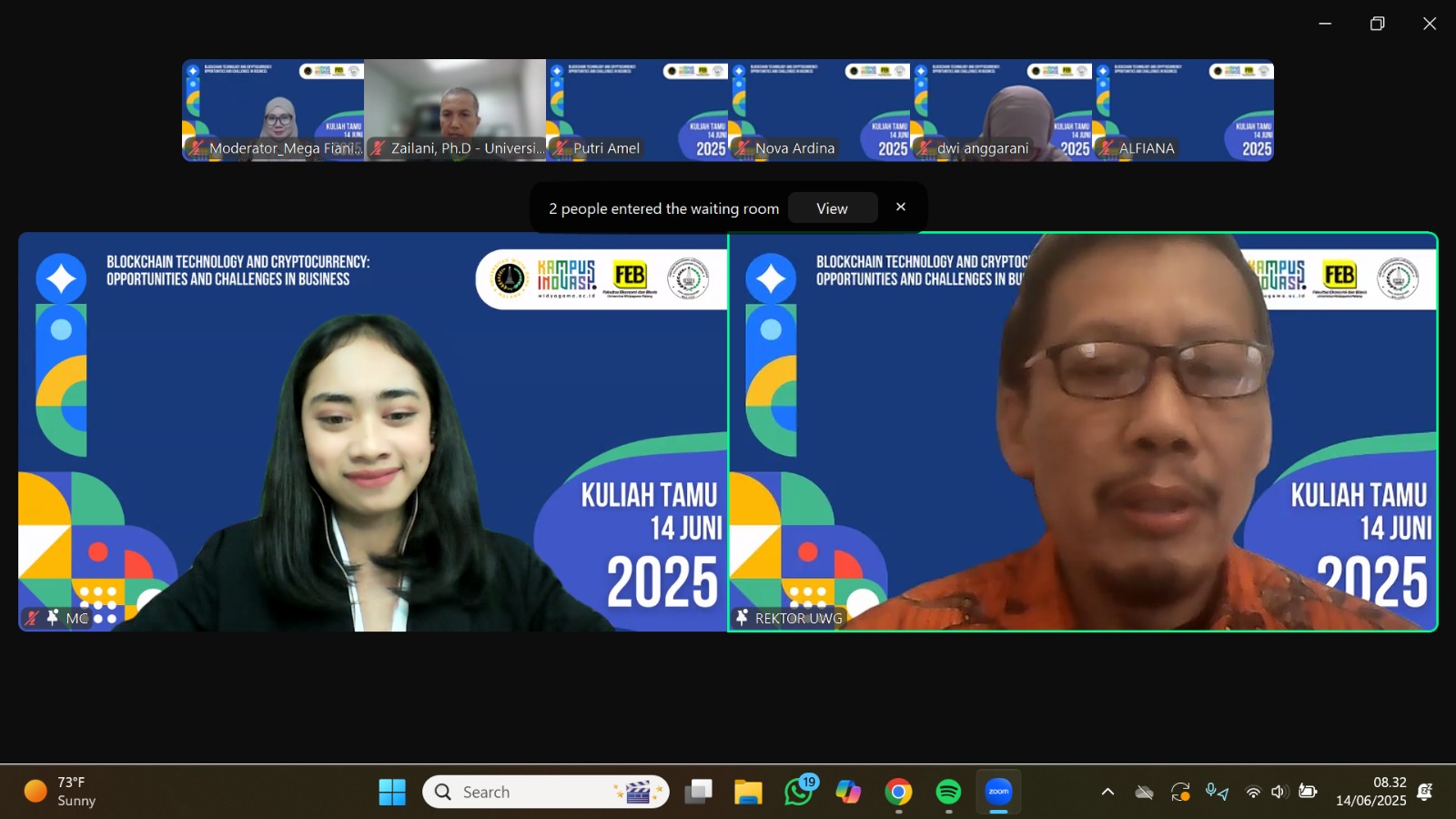 Malang, 14 Juni 2025 — Program Studi Akuntansi Fakultas Ekonomi dan Bisnis (FEB) Universitas Widya Gama (UWG) Malang sukses menyelenggarakan Kuliah Tamu Internasional dengan tema “Blockchain Technology and Cryptocurrency: Opportunity and Challenges in Business” pada Sabtu, 14 Juni 2025. Kegiatan ini dilaksanakan secara daring melalui platform Zoom Meeting dan diikuti oleh lebih dari 135 peserta dari berbagai daerah dan latar belakang, mulai dari mahasiswa, akademisi, hingga masyarakat umum yang tertarik dengan perkembangan teknologi finansial.