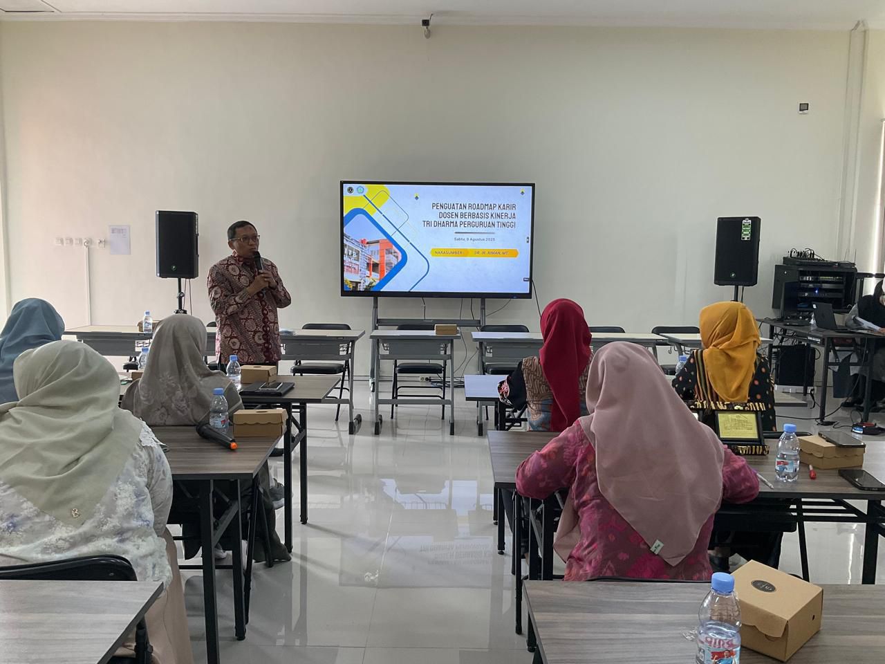 Dalam kegiatan tersebut, Dr. Riman memaparkan strategi perencanaan karier dosen yang disusun secara terintegrasi berdasarkan capaian pendidikan, penelitian, dan pengabdian kepada masyarakat. Ia menekankan pentingnya roadmap karier sebagai panduan dosen dalam mengembangkan kompetensi akademik sekaligus meningkatkan kontribusi nyata terhadap institusi dan masyarakat.